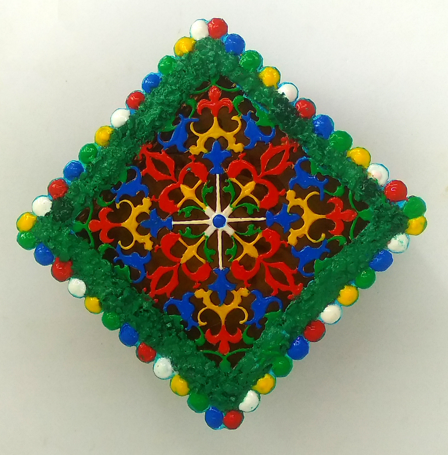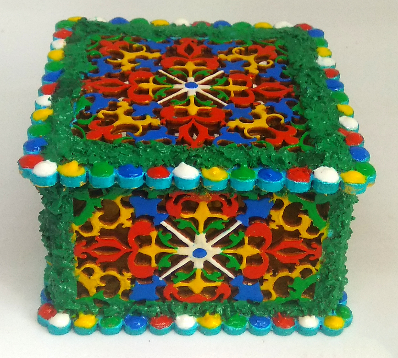 Авторская работа выполнена в технике иммитации перегородчатой эмали, что придает ей особый шарм и изысканность. Роспись акриловыми контурами и акриловой краской делает каждый элемент шкатулки ярким и насыщенным.
