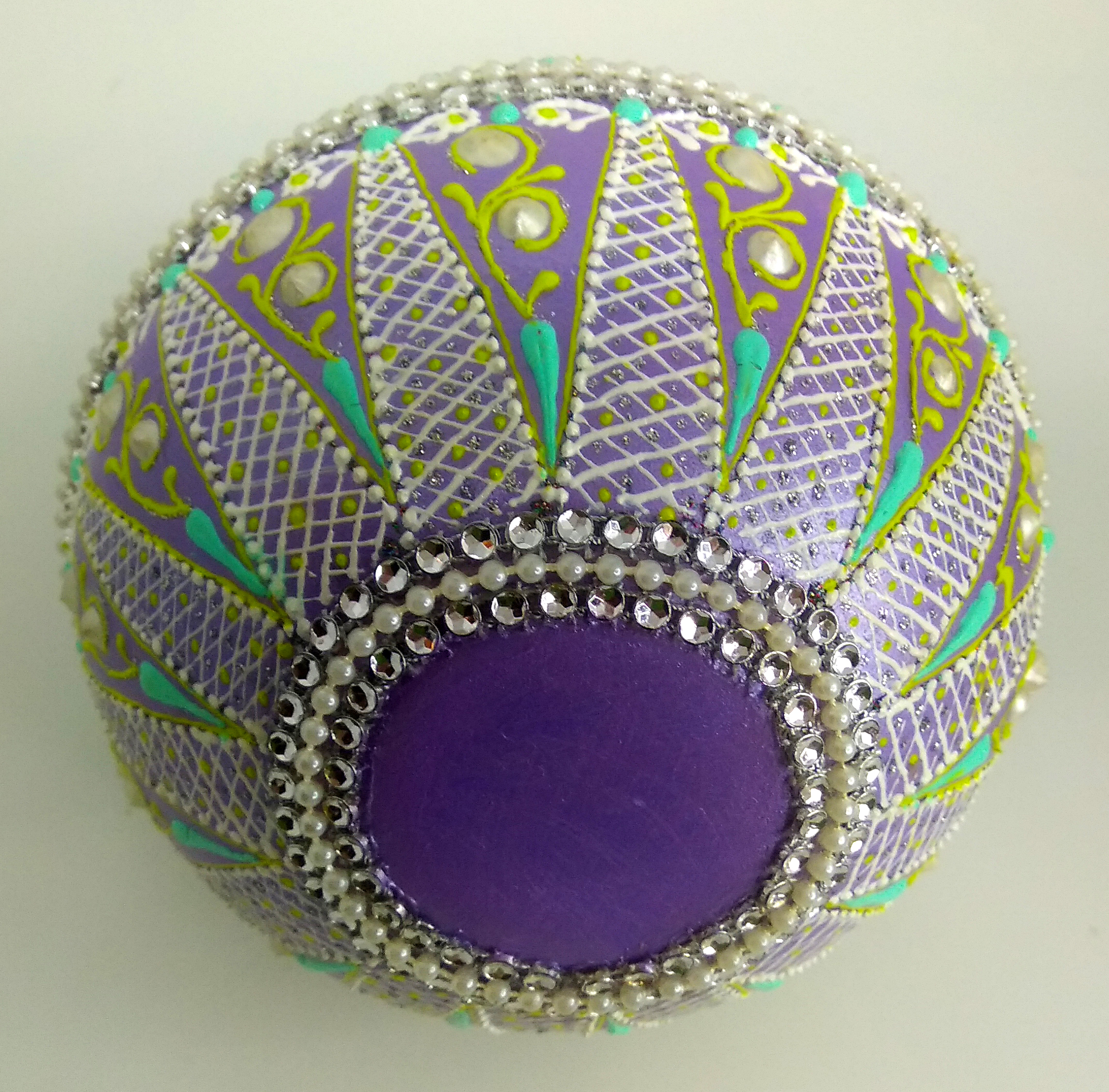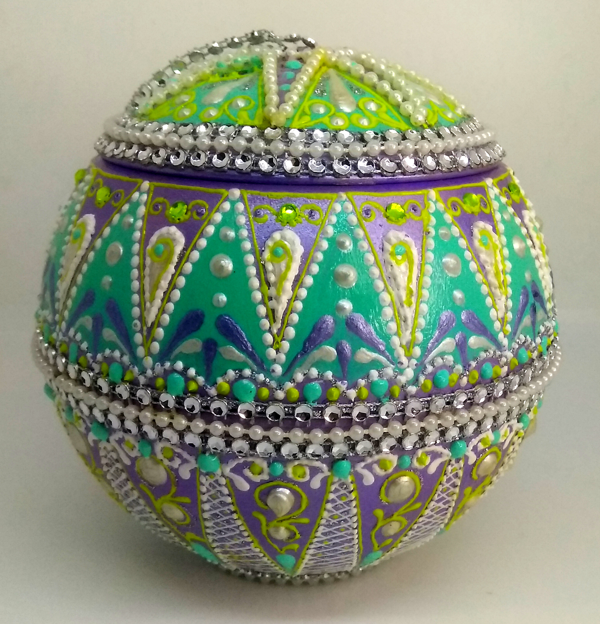 Особенностью этого сундучка является его уникальный дизайн. Роспись акриловыми контурами и контуром для создания жемчужин придает изделию неповторимый вид. Декор стразами, маленькими жемчужинами в нитке и стразами в мягкой цепочке делает его еще более привлекательным.
