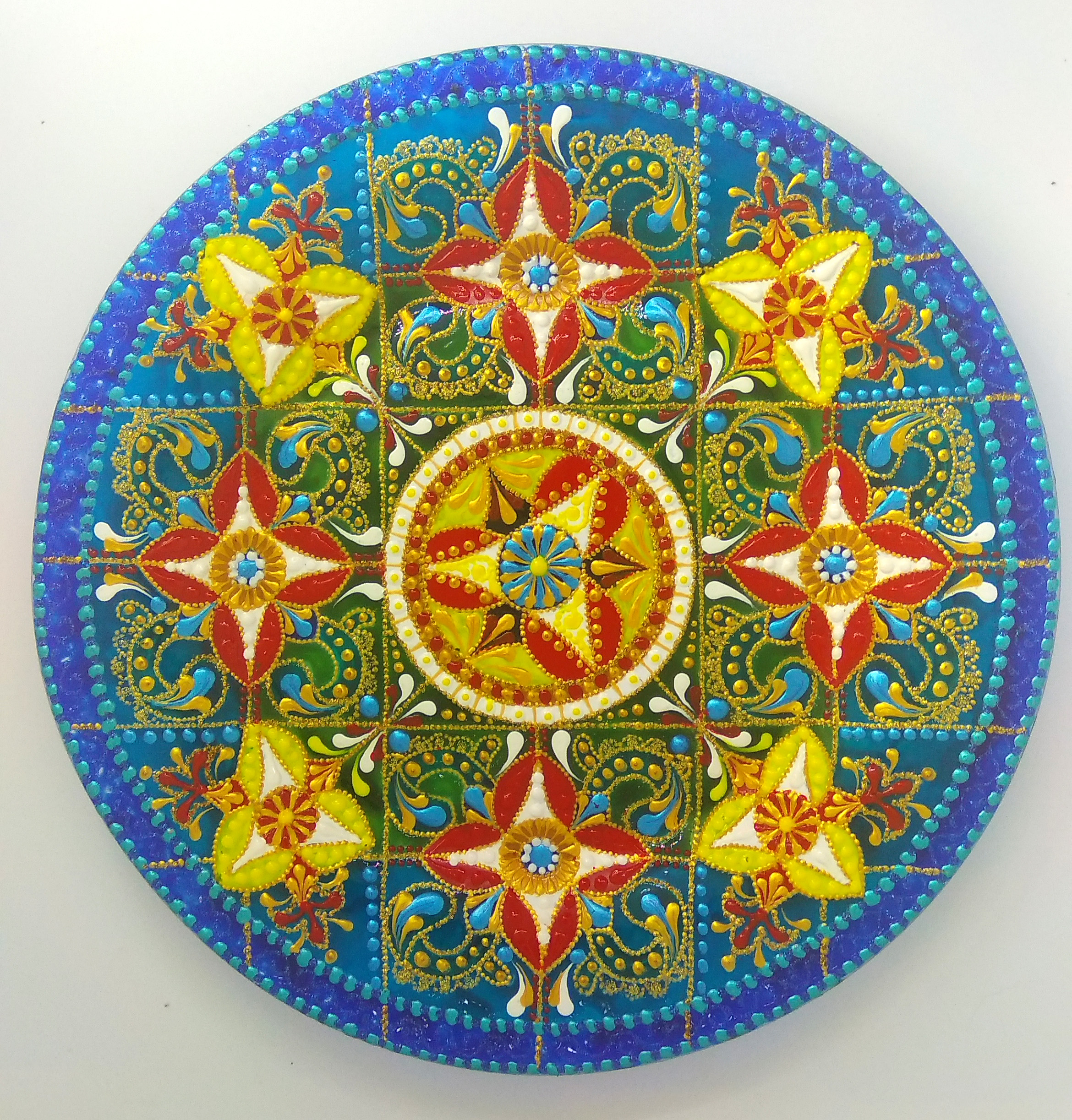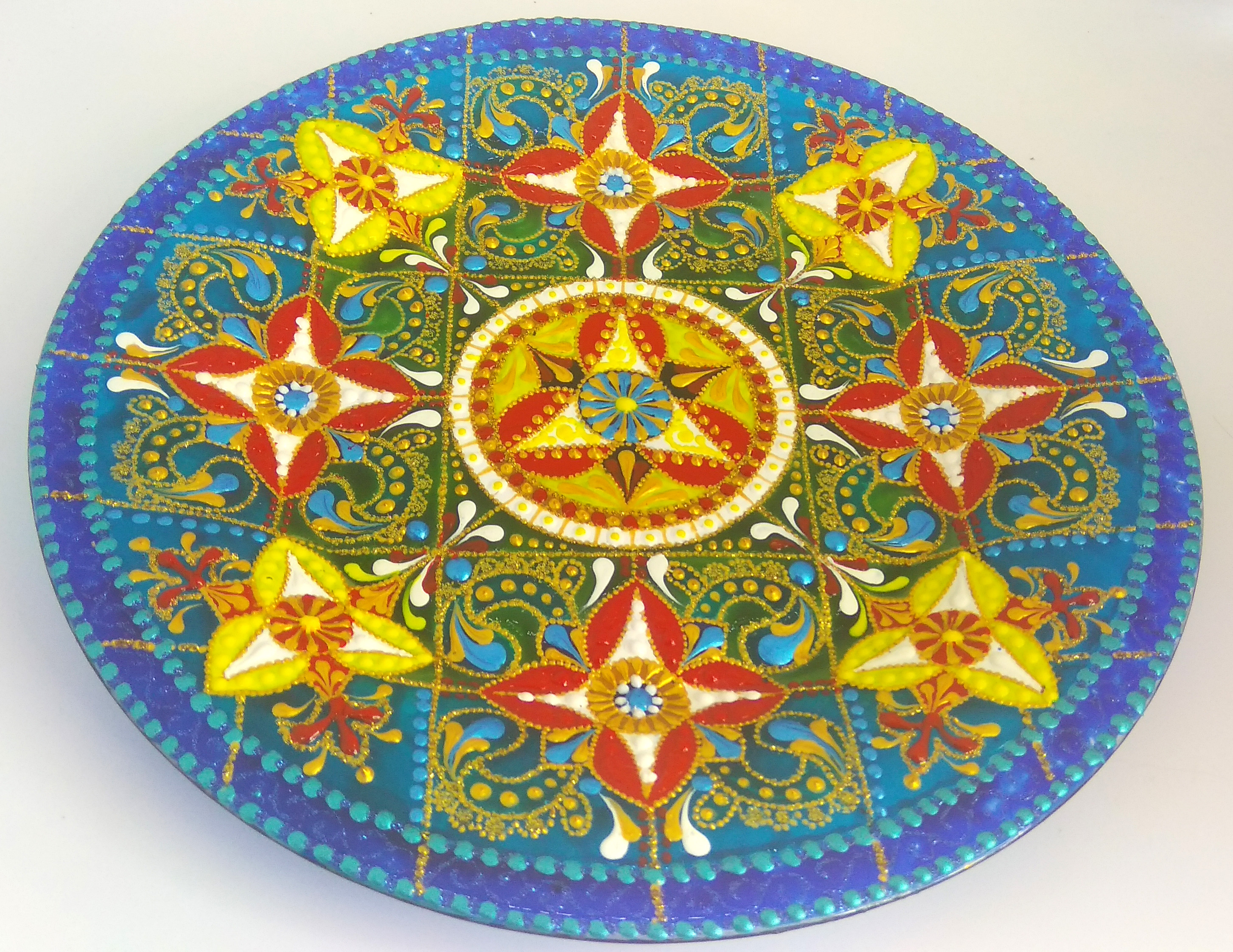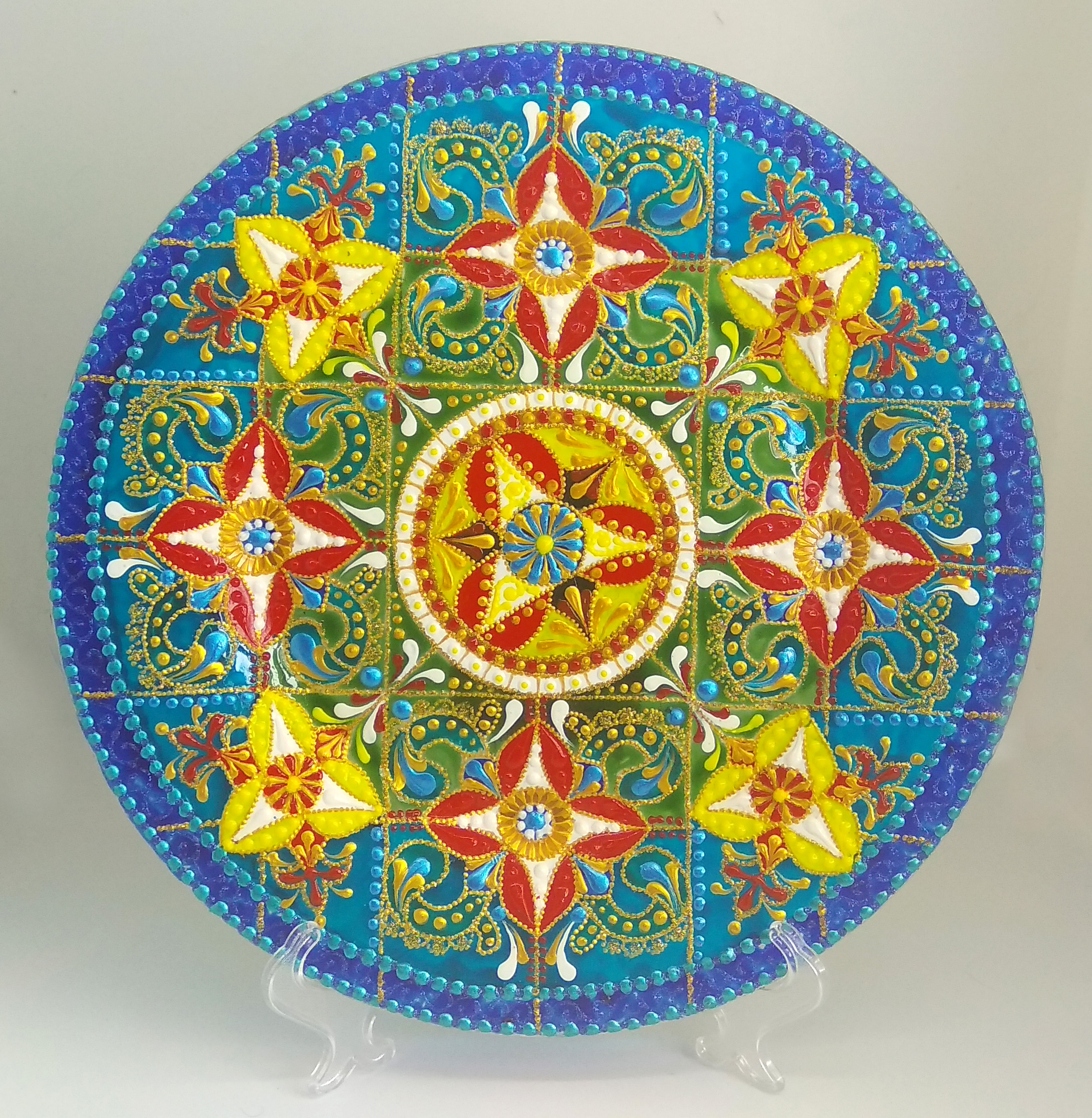 Ручная роспись выполнена на стеклянной прозрачной тарелке витражными и лаковыми красками, акриловыми контурами. Витражные краски создают яркий красивый фоновый цветовой переход от зеленого к изумрудному и синему цвету, на котором расположены большие цветочные орнаменты, выполненные лаковыми красками.