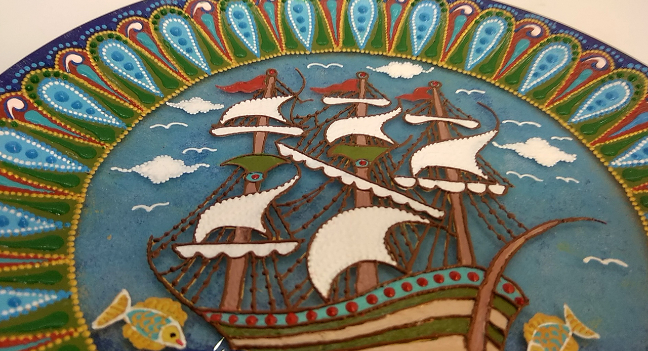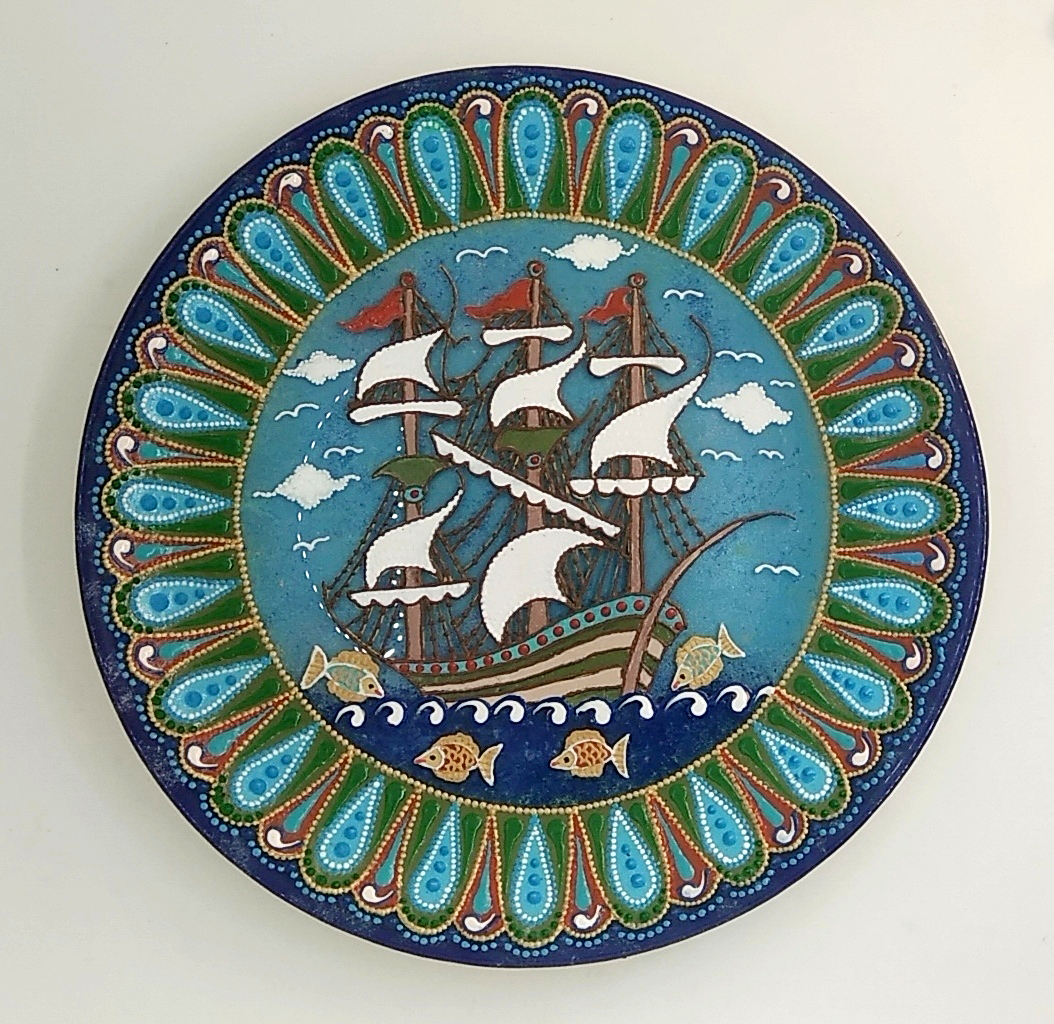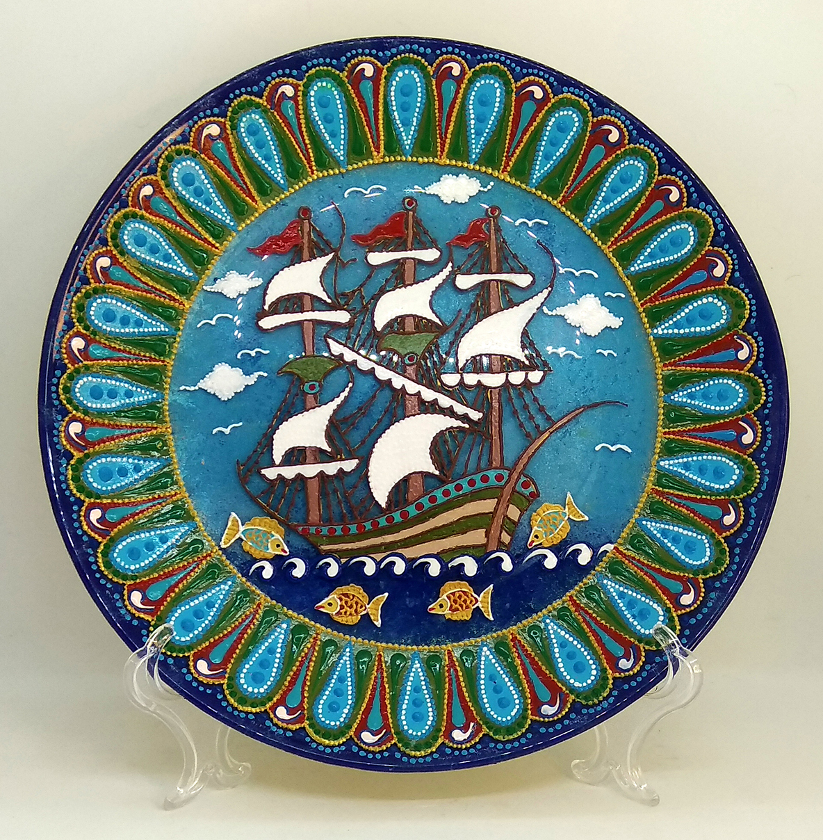 Роспись акриловыми красками и акриловыми контурами золотого, зеленого, синего, голубого, красного и белого цветов.