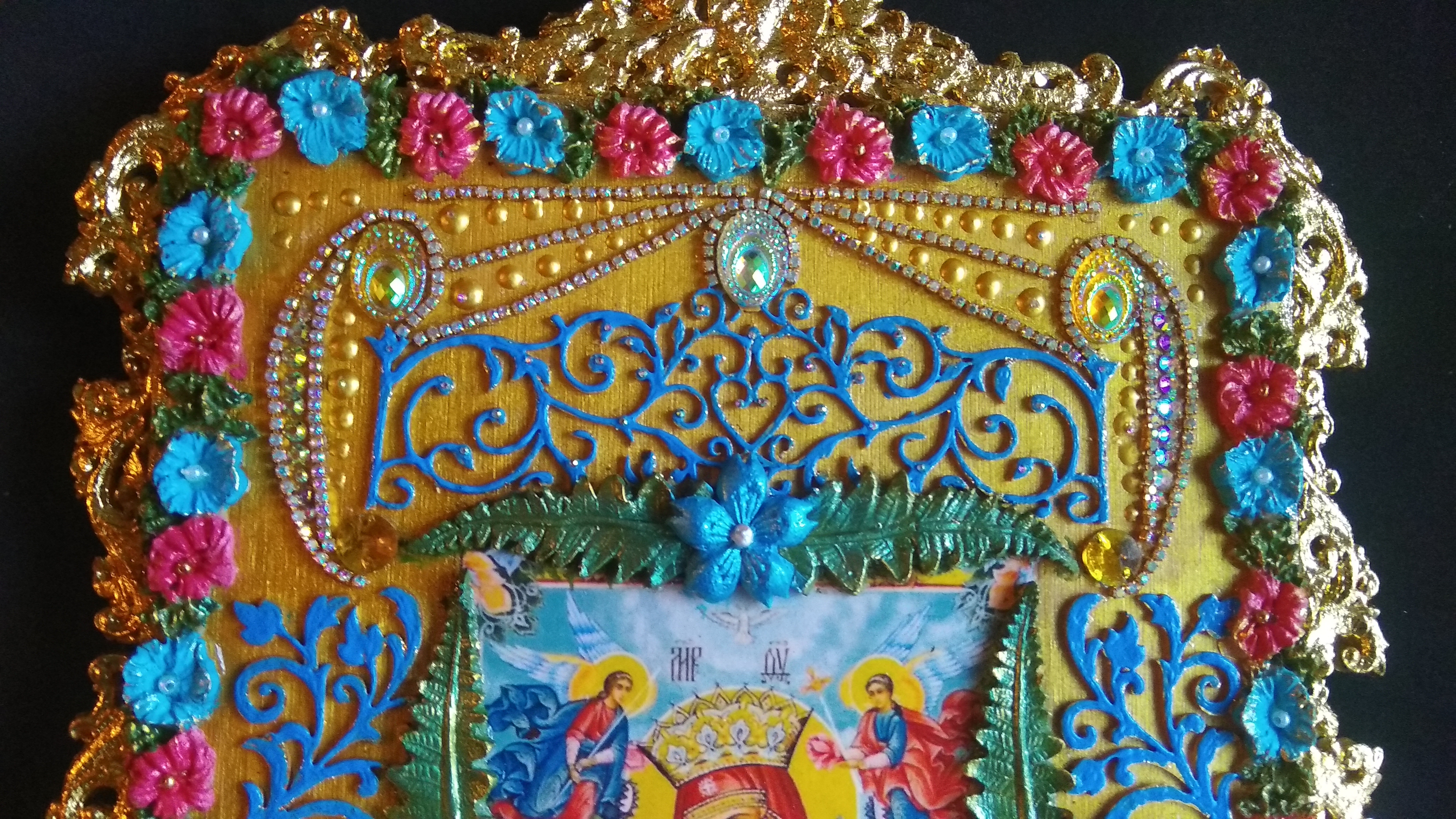 Икона украшена массой для лепки, поталью, стразами, бисером, стразами из стекла в когте, чипбордами и акриловыми контурами. Это придает ей неповторимый и яркий вид, который будет радовать глаз и вызывать восхищение.