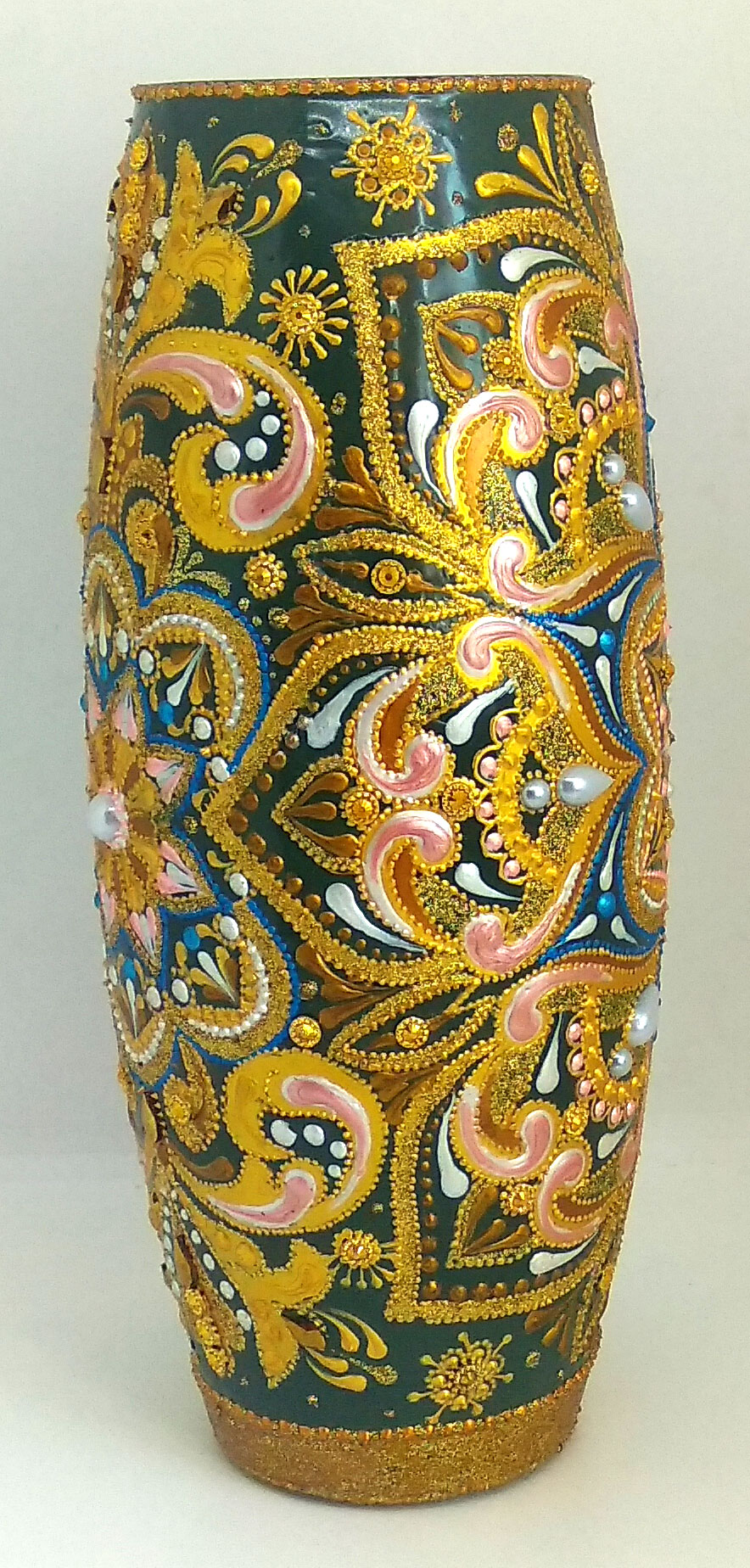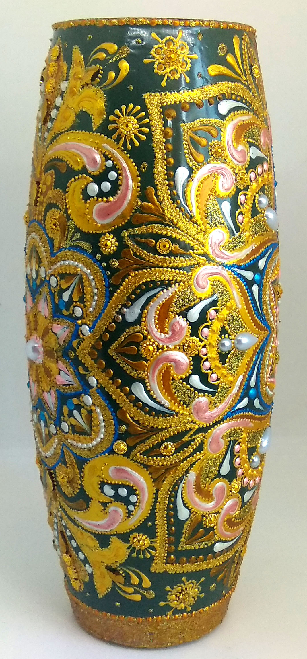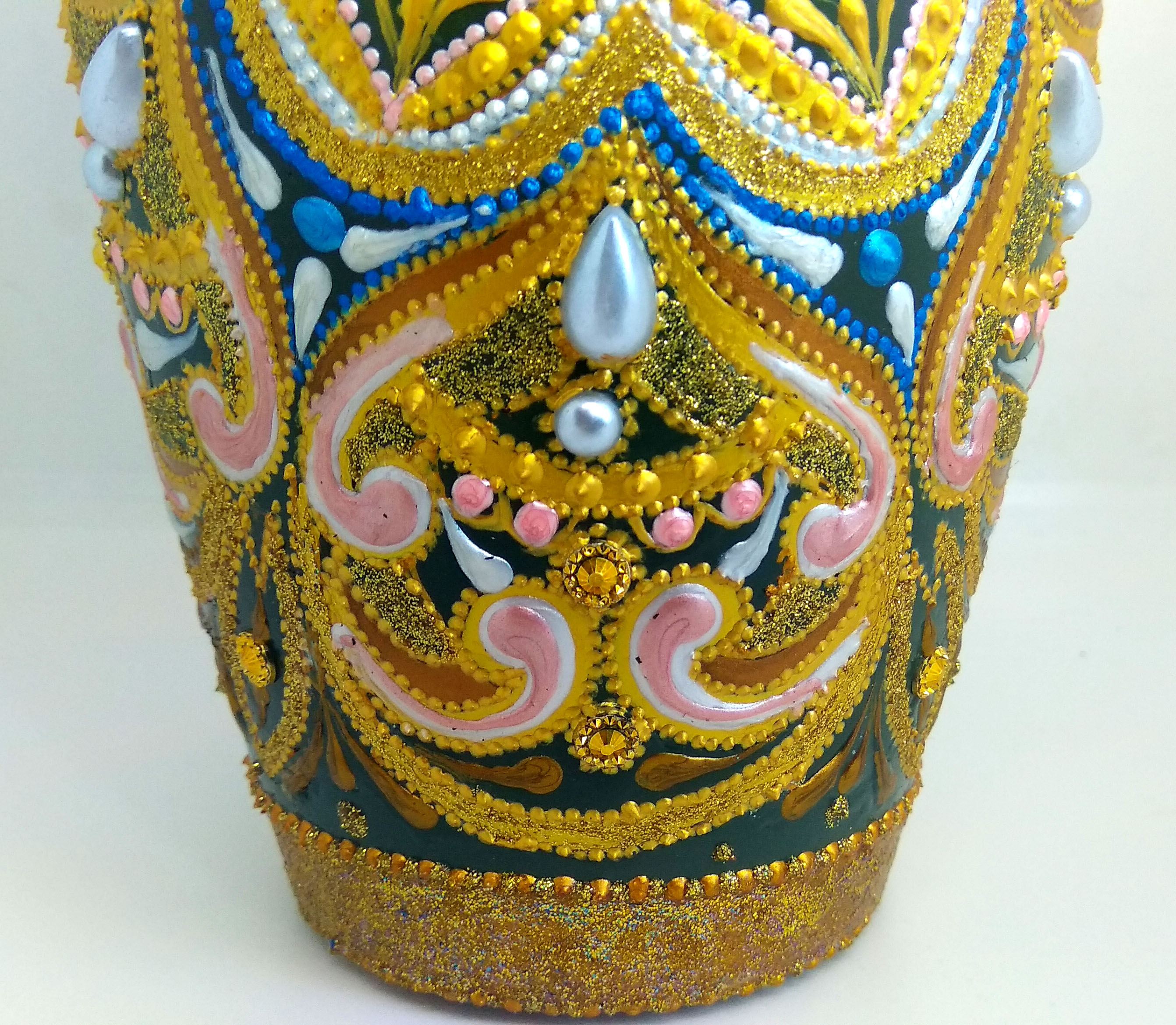 Ручная роспись выполнена акриловыми контурами и красками по стеклу и керамике, что придает вазе неповторимый и яркий вид. В декоре использованы контуры с глиттером золотого цвета, стразы цвета темного золота и искусственные полужемчужины белого цвета, что делает ее настоящим произведением искусства.